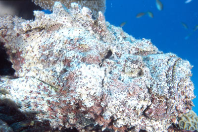 水納島は砂地のポイントが多く、砂地に点在する根の周りには多くの生物が集まっている。この日もいつものように、水深14mにある根の周りでじっくりと撮影をしていた。岩の上で2cmほどのヒメゴンベの幼魚がちょこちょこと動き回っているのが見えた。”なかなかかわいいやつだぞ”と撮影をするべくカメラ位置を決めようとしていたときだ。ヒメゴンベの上に目玉のようなものが・・・ 「オニダルマオコゼだ!!!」 なんとオニダルマオコゼの体の上を所狭しと動き回っていたのだ。ヒメゴンベは目と目の間のくぼみがお気に入りらしく、顔の周りを動き回ってはまたそこに戻ってくる。すぐ下には巨大な口が待ち構えているのだが、当の本人は自分がどれほど危険なところにいるのわかっているのか? 知らぬが仏 というより、オニダルマオコゼよ、お前は気が付いていないのか?